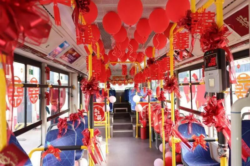 為滿足市民公交婚車個性化服務(wù)需求,公司以“個性元素設(shè)計+點對點運行”的多重專屬服務(wù)模式,將公交婚車裝扮成流動的“愛情紀念冊”,推出了常規(guī)公交車、寶寶巴士等多種車型供新人選擇,并提供迎親、賓客接送等全鏈條服務(wù)。公交婚車內(nèi)飾以彩帶、囍字掛飾營造浪漫氛圍,讓每一寸空間都盛滿愛意,“點對點”路線規(guī)劃串聯(lián)起家與幸福的彼岸,行程安全順暢,親友團全程共乘一輛車,在溫馨互動中共同見證愛情足跡,承載著歡聲笑語奔赴幸福旅程。